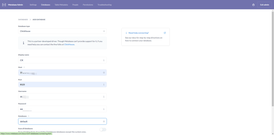 第 4 步:将 ClickHouse 与 Metabase 连接