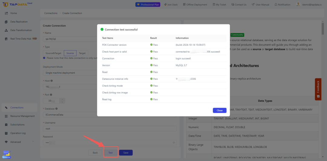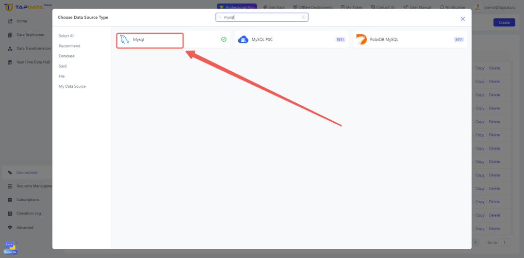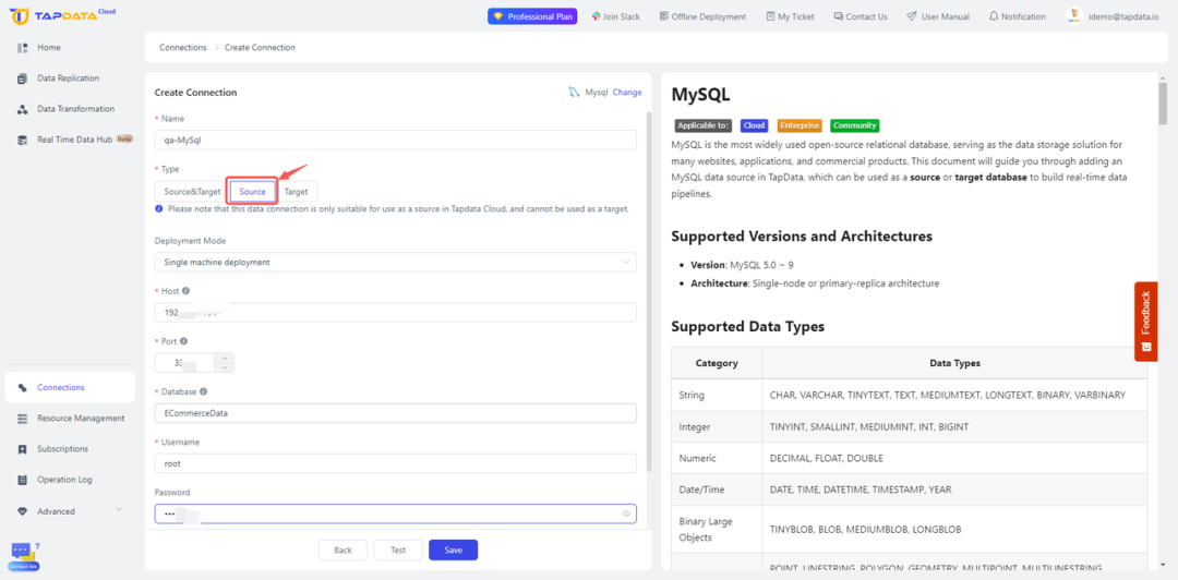 首先,建立 TapData 与待同步的源数据库(MySQL)之间的连接: