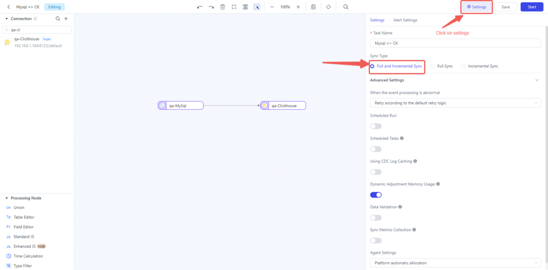 设置数据管道用以进行实时数据同步:
