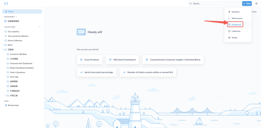 从 Metabase 首页,点击“新建仪表板”,并为其命名。
