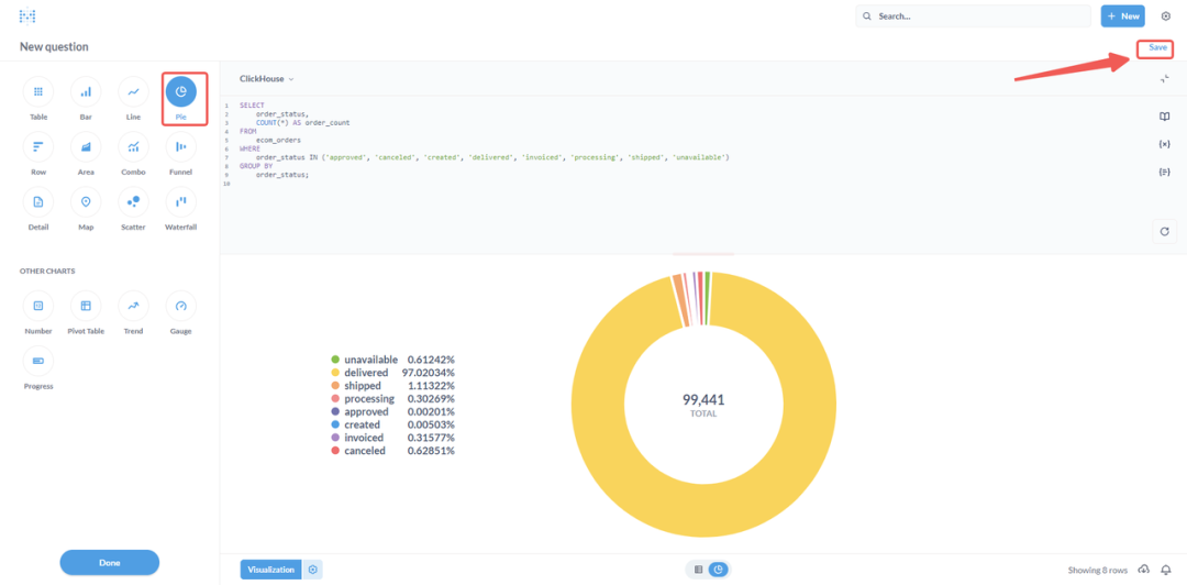 ⑥ 从可视化类型中选择“饼图”。如对饼图结果满意,即可点击“保存”按钮。