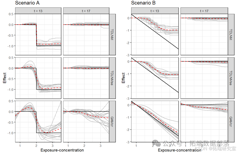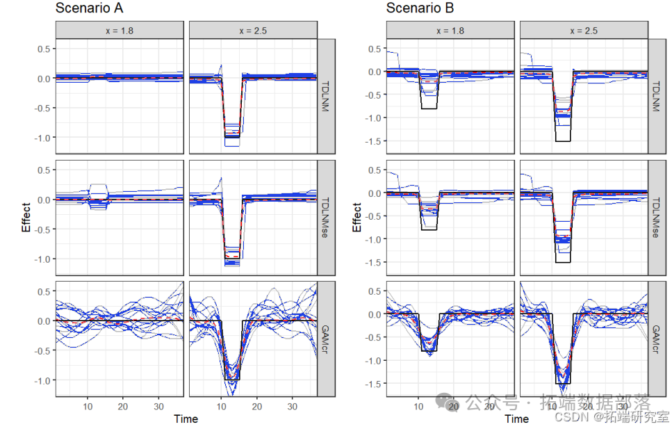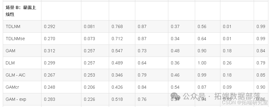 效应区域 RMSE 展示了在存在效应的区域各模型的表现,像在场景 A 中,树DLNM 在效应区域的 RMSE 为 0.213,在该场景下比部分基于样条的模型更优,不过在场景 B 中,树DLNM 和 树DLNMse 在这方面的 RMSE 高于部分基于样条的模型,因为基于样条的模型在数据点稀少的极端暴露值处插值效果更好。