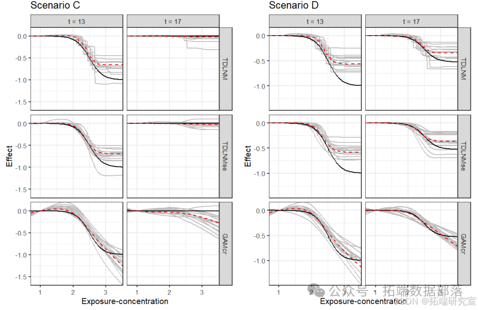 为进行对比,我们拟合了树DLNM、DLM以及几种线性模型来对比结果,这些模型的结果都与树DLNMse的结果相符,关于这些方法的更多细节可在补充材料D部分找到。