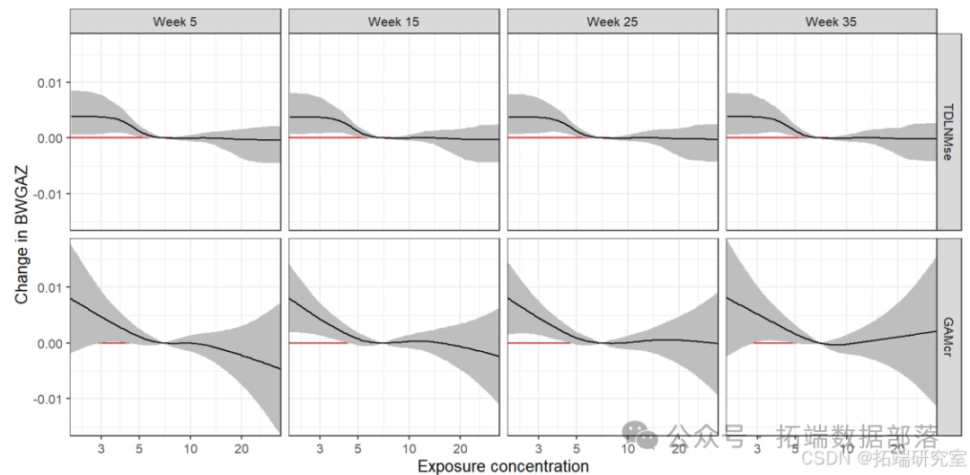 树DLNMse的后验平均暴露 - 时间 - 响应估计值展示在图4a中,低于中位数的PM2.5暴露与BWGAZ的增加相关,高于中位数的暴露浓度则表明BWGAZ略有下降,但95%可信区间并不能让我们认为这种下降与零有显著差异,这种模式在整个孕期各周都存在。