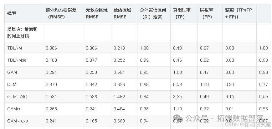 真阳性率(TP)表示在模拟关键窗口内网格点上正确识别非零效应的概率,误报率(FP)则是在模拟关键窗口外网格点上错误地识别出非零效应的概率,精度(TP/(TP + FP))综合体现了模型正确识别非零效应的能力。树DLNM 和 树DLNMse 在所有模拟场景中的精度都是较高的,像在场景 A 中精度能达到 1.00(树DLNM)和 0.98(树DLNMse),高精度源于误报率(FP)近乎为零,但在 B 和 D 场景中存在真阳性率(TP)较低的权衡情况。