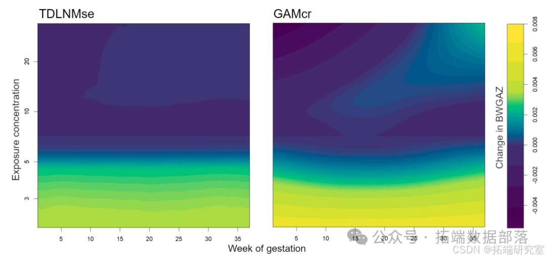 f(x\\\_i) = ∑\\\_{t = 1}^T w(x_{it}, t)其中 w(x, t) 是将孕期第 t 周的暴露与结果相关联的暴露 - 响应函数。现有的DLNM框架利用交叉基,其中 w 在暴露浓度和时间维度上表示为双变量基扩展。惩罚样条实现允许对暴露 - 时间 - 响应的结构做出一系列假设,比如不同的岭惩罚针对特定时间的收缩,不同的差分惩罚控制曲线的平滑度。基扩展方法(如样条)可对模型进行正则化,以在预测变量存在多重共线性的情况下提高估计效应的稳定性,但这些方法也对DLNM强加了平滑性假设。