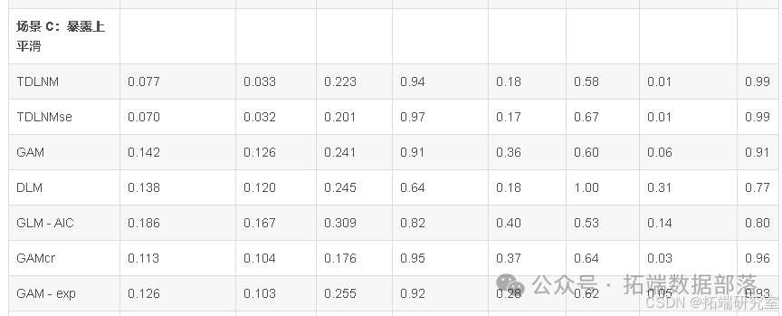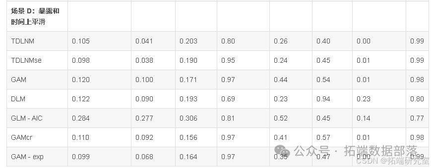 无效应区域 RMSE 则反映了在暴露 - 时间 - 响应曲面中效应为零区域各模型的偏差情况,在所有场景下,基于树的方法(树DLNM 和 树DLNMse)在这方面具有优势,比如场景 D 中,树DLNM 的无效应区域 RMSE 为 0.041,相对部分其他模型更低,意味着在无效应区域它们的估计更接近真实情况,这得益于树特定参数上的收缩先验降低了方差,从而在无效应区域导致更低的 RMSE。