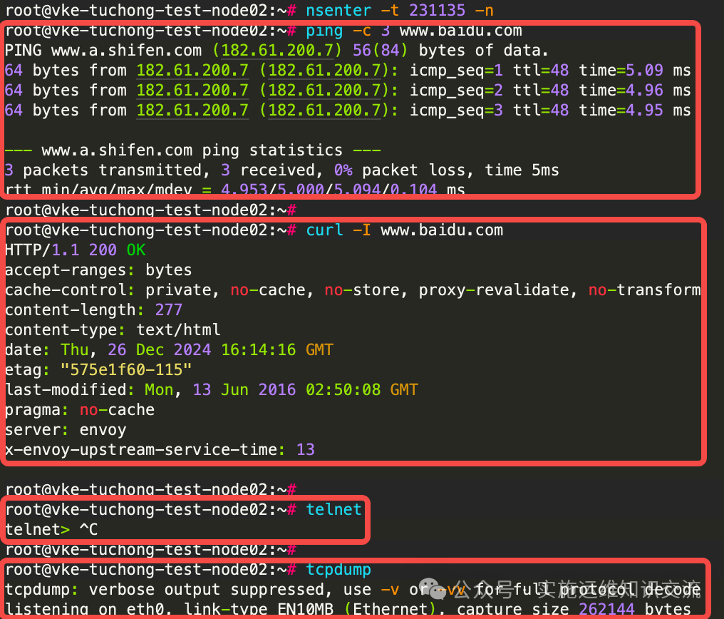 由此可见,我们可以通过 nsenter 进入 Pod 中容器(进程)的网络命名空间,利用 Node 节点已有的命令行工具实现对 Pod 进行网络调试。