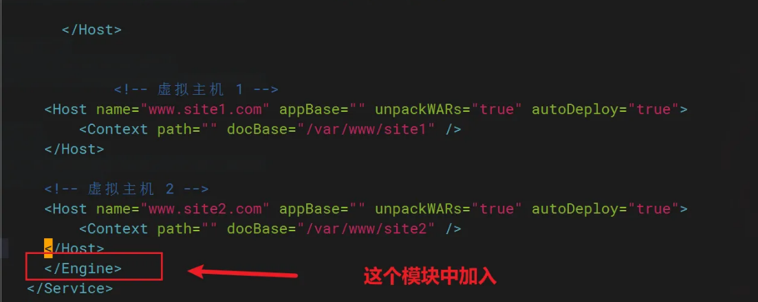 </Engine>name:虚拟主机的域名,例如 www.site1.com 和 www.site2.com。appBase:设置为空字符串 "",因为我们直接指定了 docBase。 对应应用部署的目录docBase:虚拟主机的文档根目录,分别为 /var/www/site1 和 /var/www/site2。path:设置为 "",表示虚拟主机的根路径(/)。补充说明:Engine节点 是核心组件之一 用于管理虚拟主机 下面可以定义多个host节点