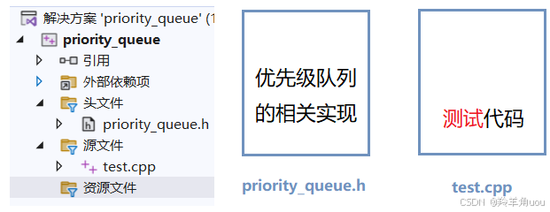建立一个头文件priority_queue.h,一个源文件test.cpp,存放内容如下。