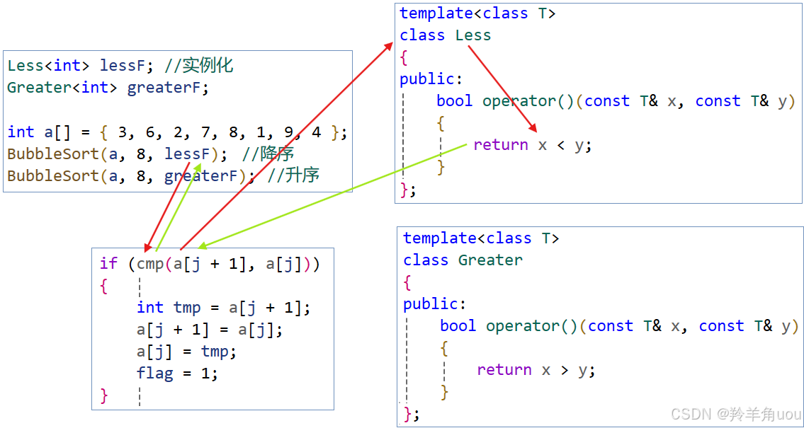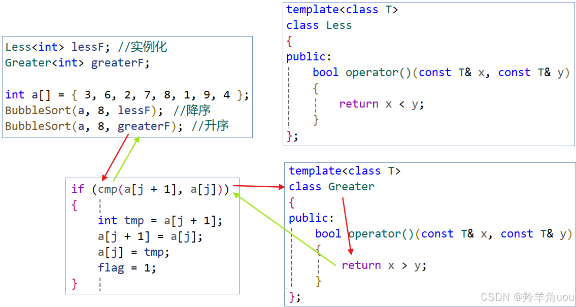 我们还可以写一个Greater类,里面的operator()也是实现两个数的比较,比较逻辑和Less相反。