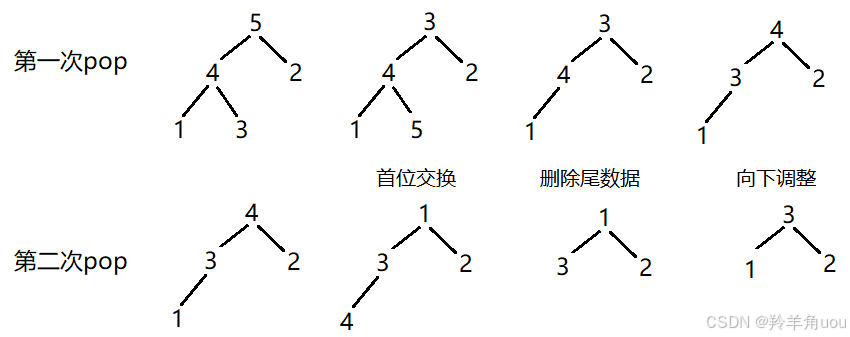 在数据结构中介绍过,删除数据是删除堆顶数据。删除数据的逻辑是将收尾数据交换,交换后要删的数据在最后,然后再尾删,后用向下调整算法,将堆恢复。