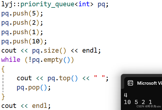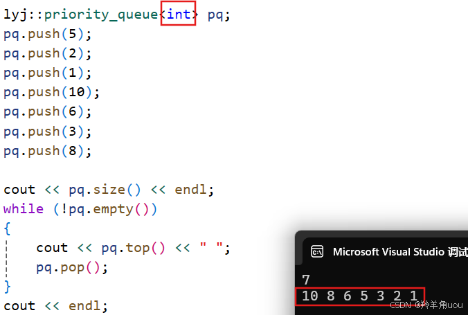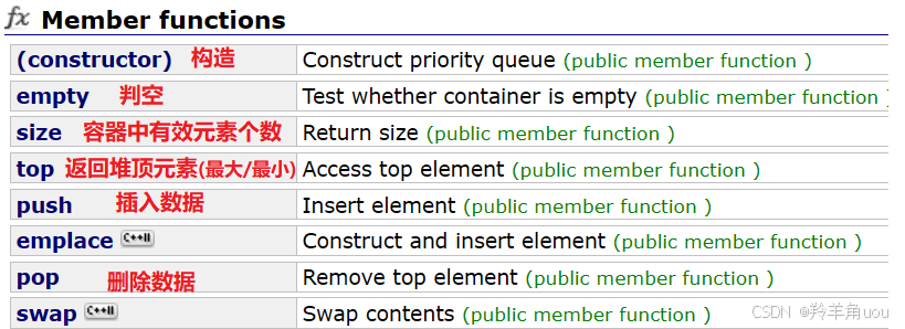 在C++中优先级队列的相关接口就是如上这些。这里的top,如果大的值优先级高,也就是大堆,top返回的就是堆里面的最大值,如果是小的数优先级高,也就是小堆,返回的就是最小值。