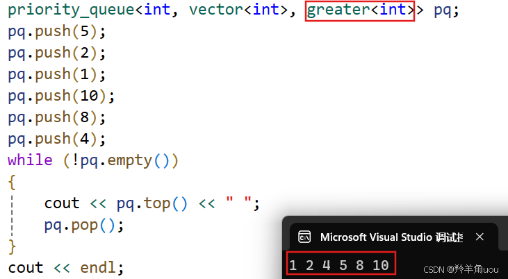 priority_queue<int, vector<int>, greater<int>> pq;改成greater,用同样的用例试试。