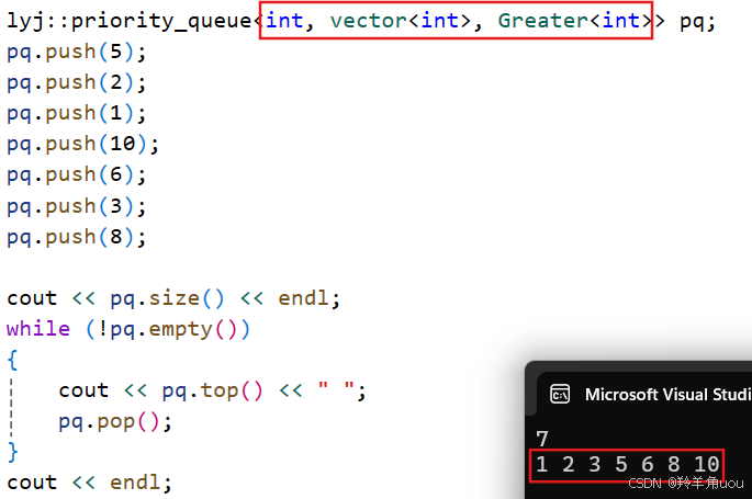 我们前面说过,优先级队列默认为大堆,但是给第三个参数传greater过去,就可以改成小堆,这里说的less和greater就是仿函数。