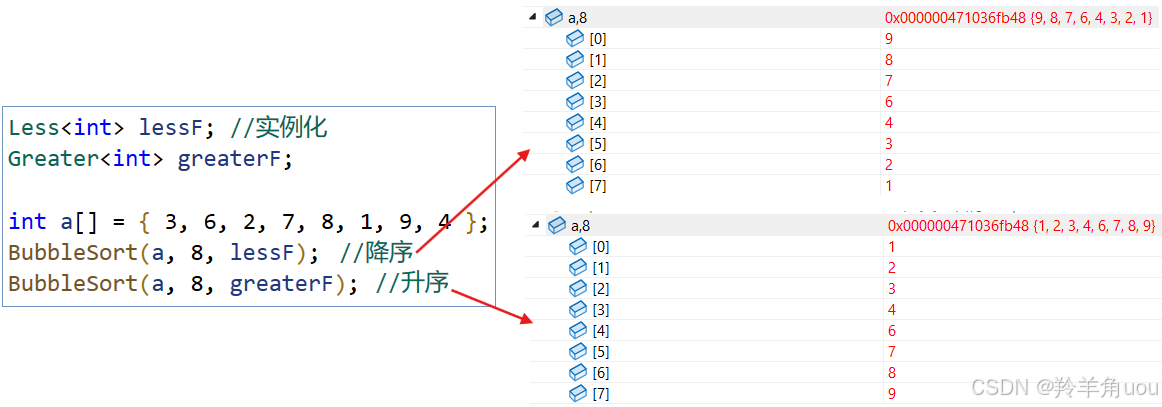BubbleSort(a, 8, Less<int>()); //传匿名对象
