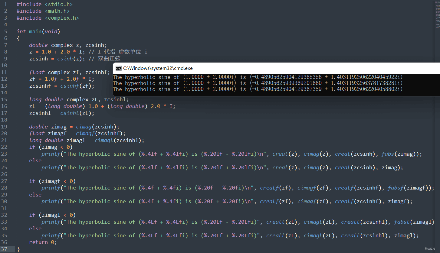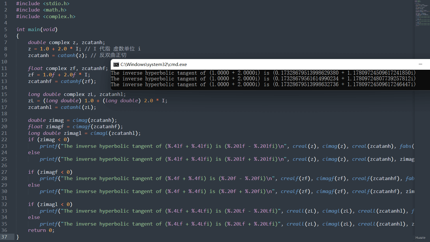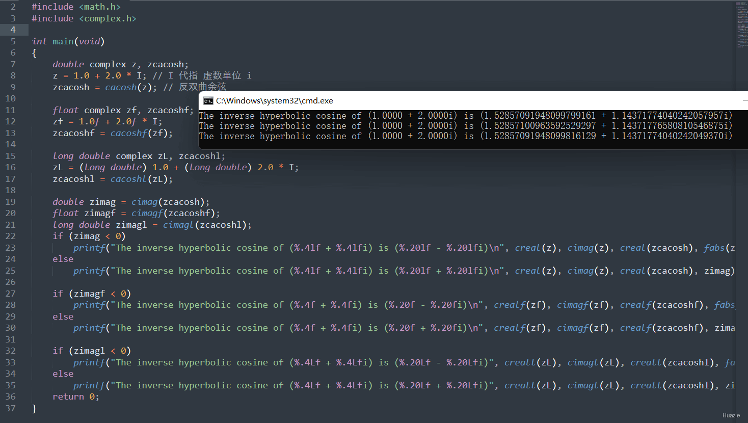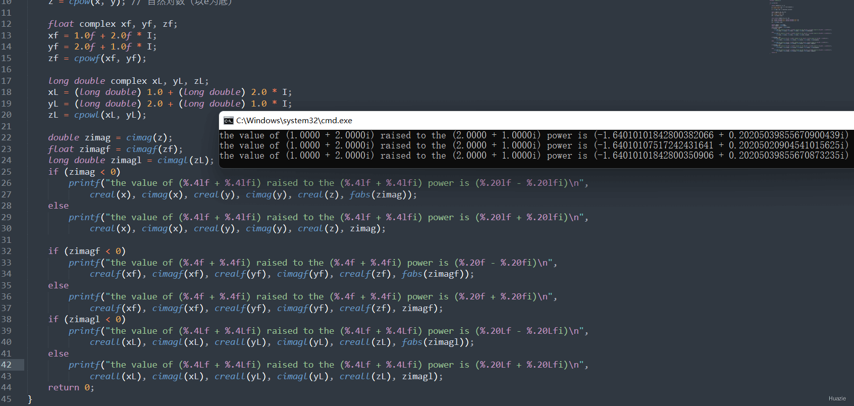printf("The base-e exponential of (%.4f + %.4fi) is (%.20f - %.20fi)\n", crealf(zf), cimagf(zf), crealf(zcexpf), fabsf(zimagf));