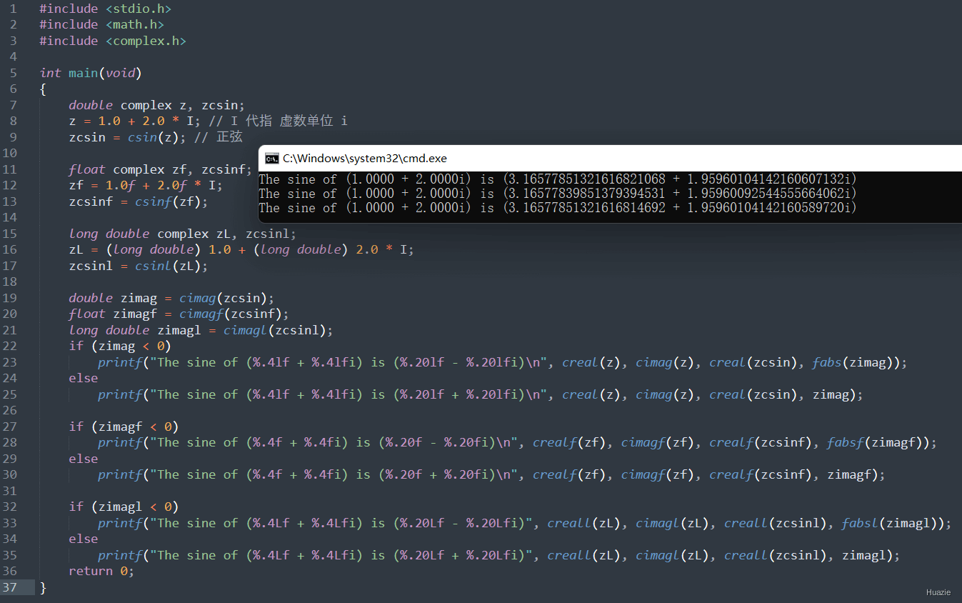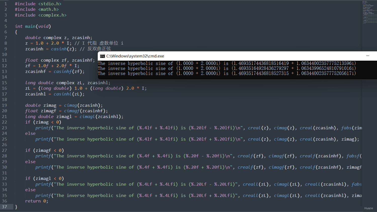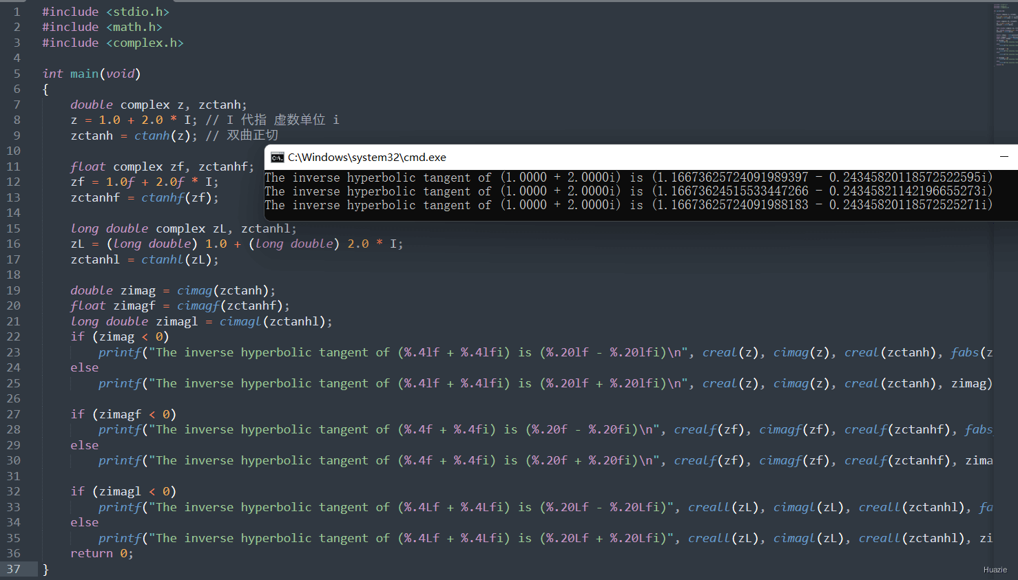 printf("The base-e exponential of (%.4f + %.4fi) is (%.20f - %.20fi)\n", crealf(zf), cimagf(zf), crealf(zcexpf), fabsf(zimagf));