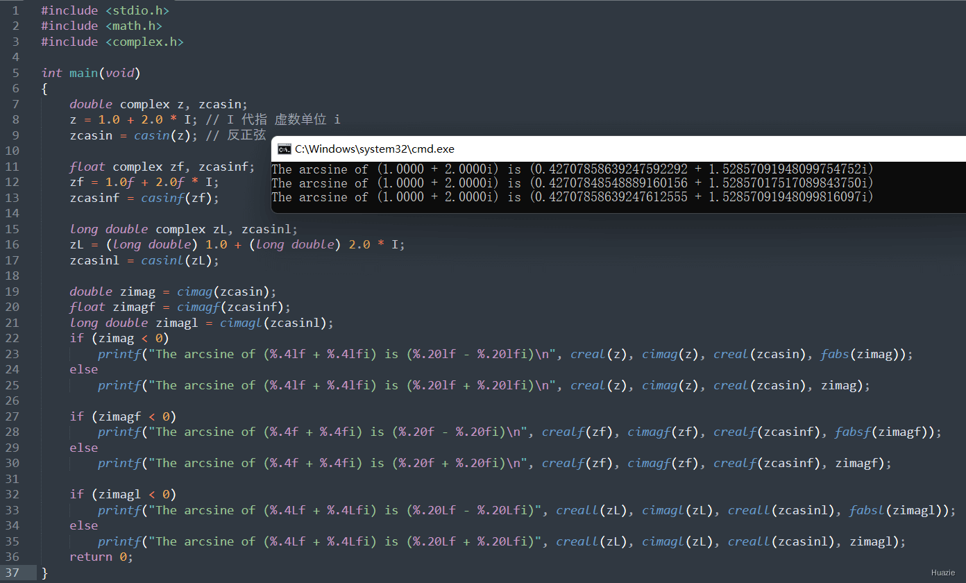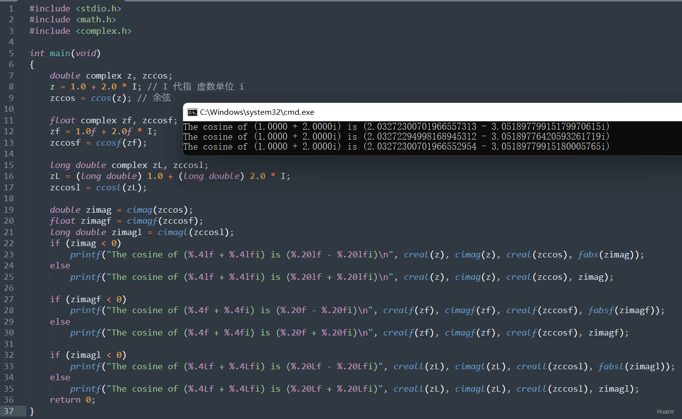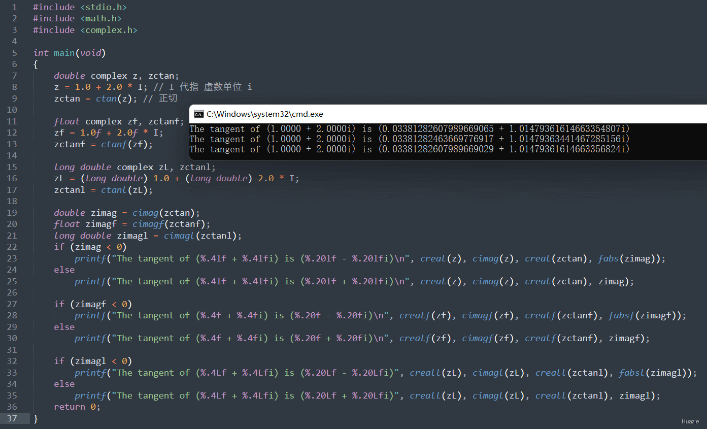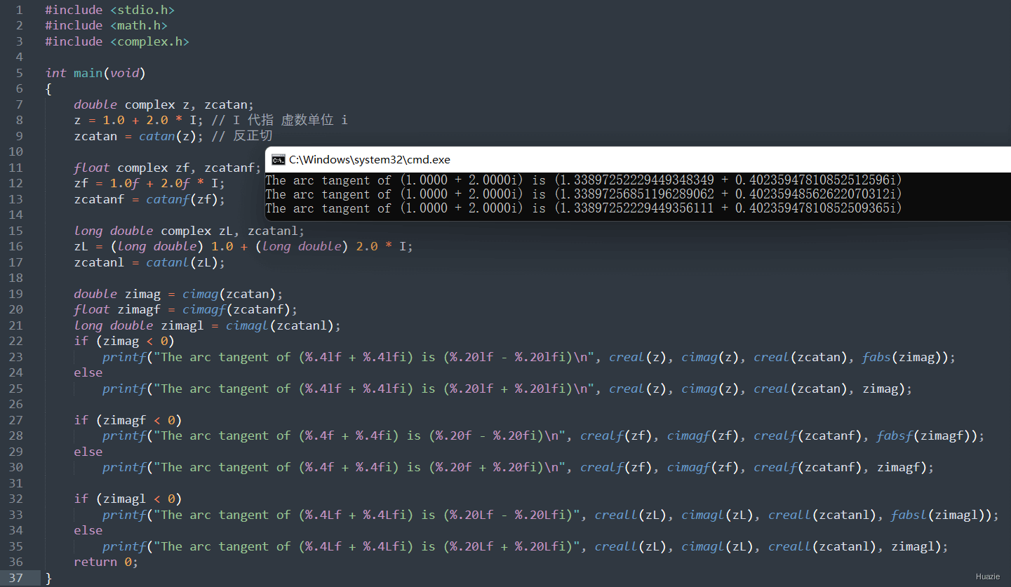 printf("The base-e exponential of (%.4f + %.4fi) is (%.20f - %.20fi)\n", crealf(zf), cimagf(zf), crealf(zcexpf), fabsf(zimagf));