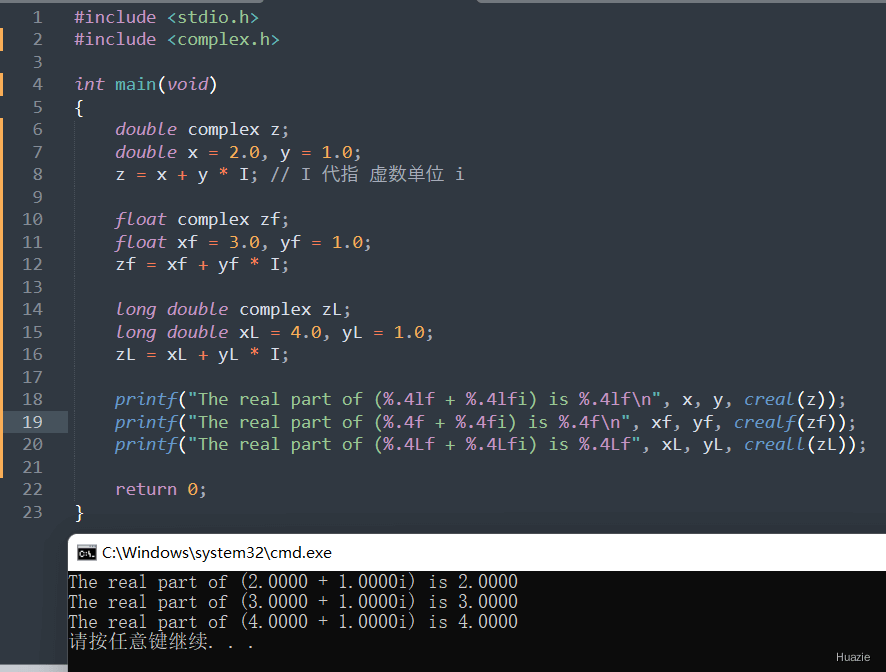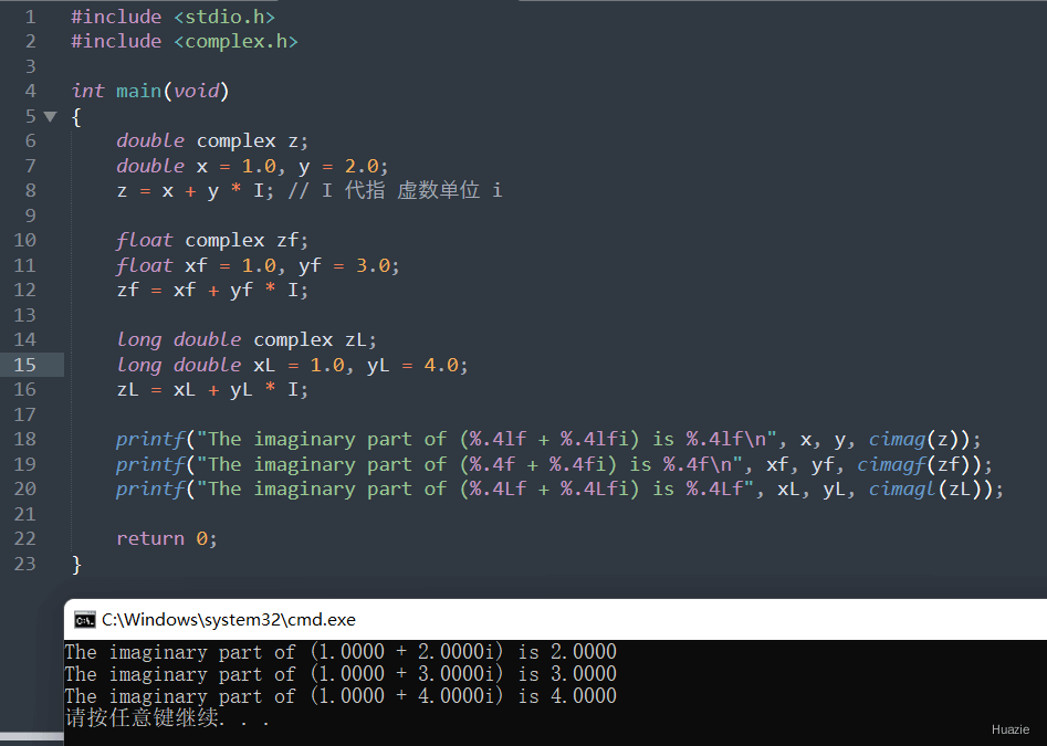 printf("The square root of (%.4f + %.4fi) is (%.20f + %.20fi)\n", crealf(zf), cimagf(zf), crealf(zcsqrtf), zimagf);