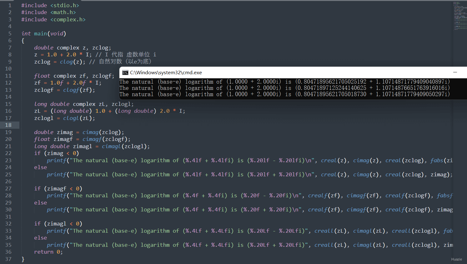 printf("The natural (base-e) logarithm of (%.4f + %.4fi) is (%.20f + %.20fi)\n", crealf(zf), cimagf(zf), crealf(zclogf), zimagf);