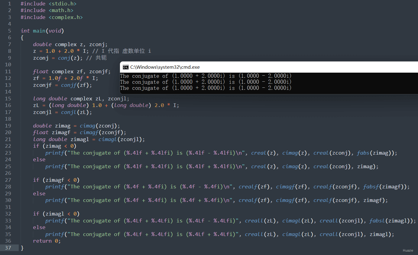printf("The conjugate of (%.4f + %.4fi) is (%.4f - %.4fi)\n", crealf(zf), cimagf(zf), crealf(zconjf), fabsf(zimagf));