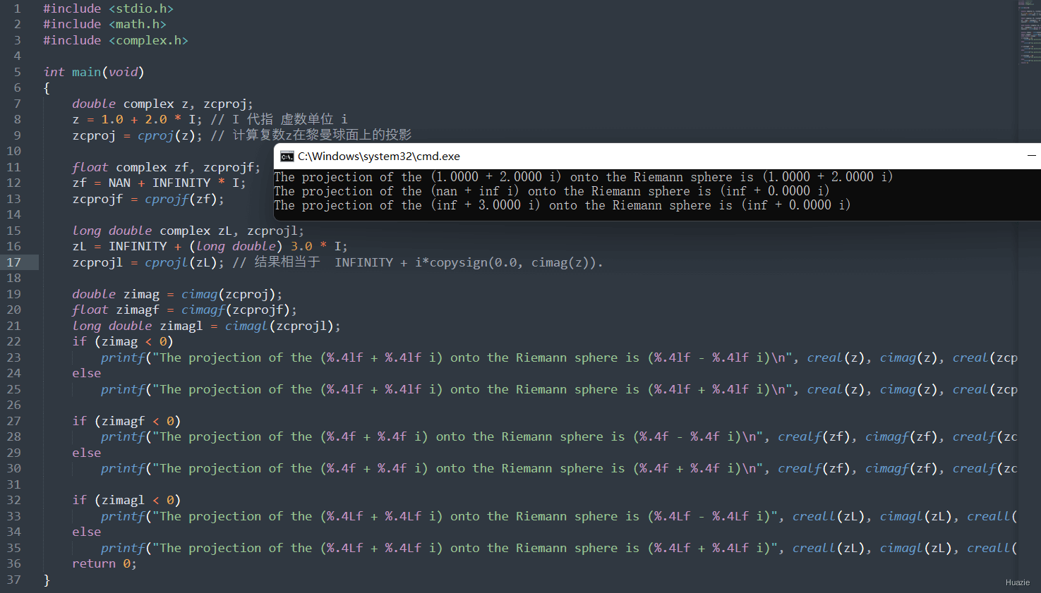 printf("The projection of the (%.4f + %.4f i) onto the Riemann sphere is (%.4f + %.4f i)\n", crealf(zf), cimagf(zf), crealf(zcprojf), zimagf);