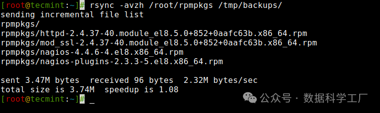 [root@tecmint]# rsync -avzh /root/rpmpkgs /tmp/backups/