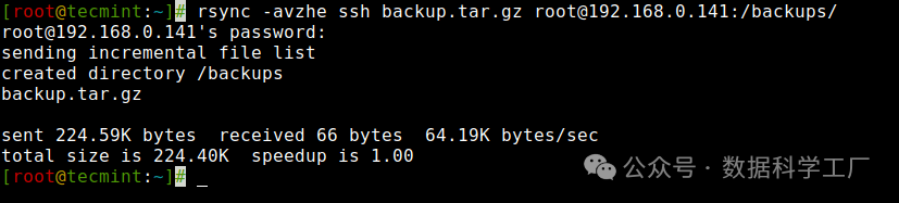 # rsync -avzhe ssh backup.tar.gz root@192.168.0.141:/backups/