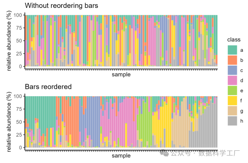 这里有一个包含100个样本和8个成员类别的数据示例。由于样本和类别众多,如果不对条形图的顺序进行优化,很难从图表中看出任何信息。我在看什么?优化条形图的顺序后,哇,这真的让图表变得清晰多了,不是吗?