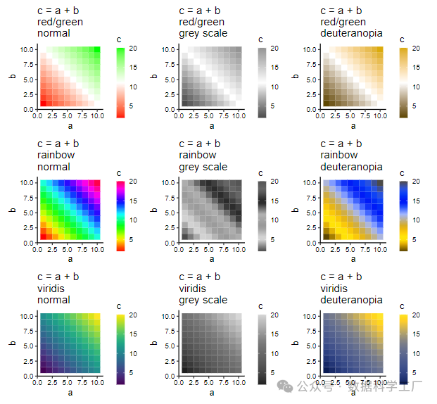 Deuteranomaly 是最常见的红绿色觉异常类型,大约每16名男性中有1名,每256名女性中有1名会受到影响。任何同时使用红色和绿色渐变的色带对于红绿色觉异常的人来说都是难以区分的(如图中的第三列所示)。此外,红/绿色和彩虹色系在黑白打印时(即灰度打印,如图中的第二列)几乎无法保留有效信息。许多科学软件仍旧默认使用红/绿色或彩虹色系,这让我感到非常困扰。更“先进”的色系,比如 viridis,不仅对色觉异常者友好,而且在灰度打印下也能保持信息的完整性(如图中的第三行所示)。而且,它们的外观也很吸引人。