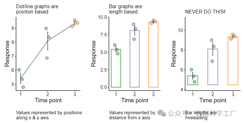 这常常是讨论中被忽视的重要问题,也是许多误导性图表的核心问题。例如,我在三个时间点上测量了一个响应变量。在接下来的三个图表中,有两个是可以接受的,但有一个却犯了数据可视化的大忌。你能发现问题所在吗?