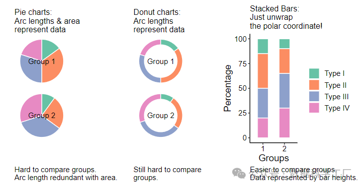 以这个例子来说,我们有两个大类,每个大类下有4个子类。在传统的饼状图中,角度(以及相应的弧长和扇区面积)用来表示数据。但这样做的问题在于,不同大类之间的数据比较变得非常困难。我们可以将饼状图简化为环状图,此时数据通过弧长来表示。但如果我们想用长度来展示数据,为什么不直接将环状图展开,制作成堆叠条形图呢?在堆叠条形图中,条形并排展示,这样跨组比较就变得容易多了。