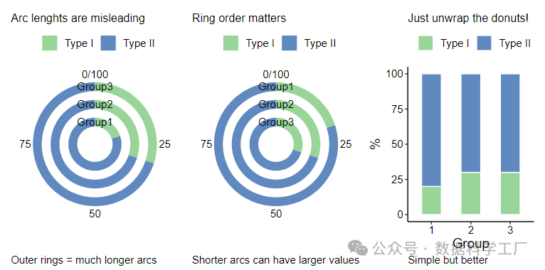 在同心圆环图中,人们可能会误以为数据是通过弧长来表示的,但实际上这种理解是错误的。外圈的弧长远远超过内圈。第二组和第三组的数据值完全相同,但第三组的弧长却长得多。实际上,数据是通过弧角来表示的,而我们人类并不擅长解读弧角。
