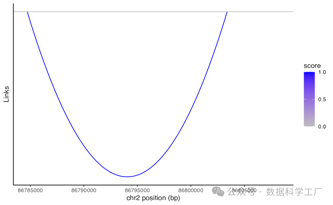 利用 LinkPlot() 函数,可以绘制基因组位置上的相互关系。该函数会以弧线形式展示两个相关位置之间的连接,弧线的透明度与该连接的评分成正比。这种连接可以用来表示多种信息,比如调控关系(例如,将增强子与其调控的基因相连),或者是实验数据,比如染色体互作(Hi-C)。
