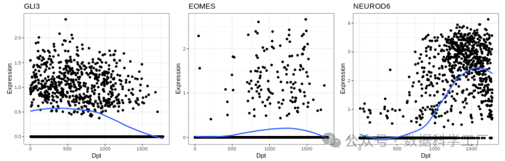为了展示沿着构建的伪时间的表达变化,带有拟合曲线的散点图通常是一种直观的方法。