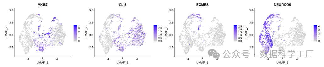首先,提取感兴趣的细胞。接下来,会重新识别这些细胞的高变基因,因为在这些细胞之间,代表背侧端脑细胞与其他细胞的差异的基因不再是有用的。