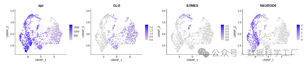 如前所述,在 UMAP 嵌入中看到的背侧端脑细胞形成的类似轨迹的结构,很可能代表了背侧端脑兴奋性神经元的分化和成熟过程。这个过程很可能是连续的,因此将其视为一个连续的轨迹,而非不同的聚类,更为合适。在这种情况下,进行所谓的伪时间细胞排序或伪时间分析会更加具有信息价值。