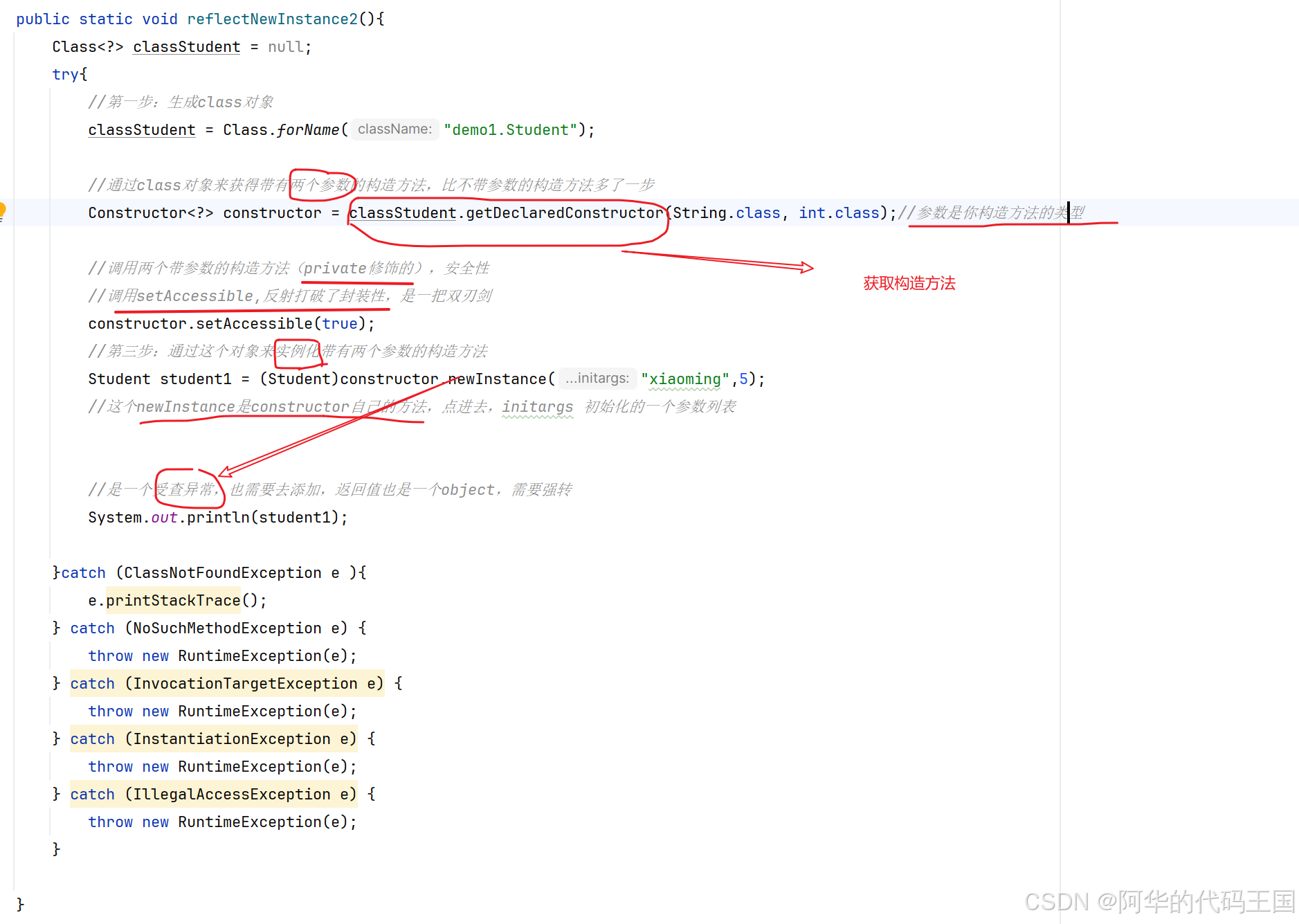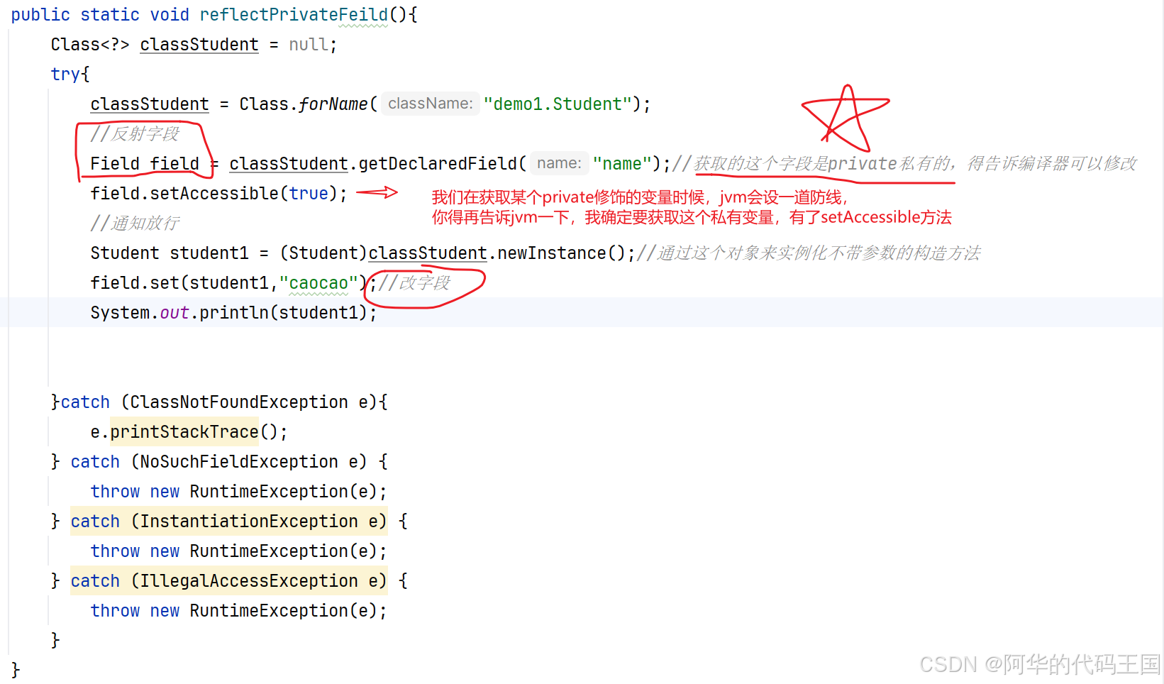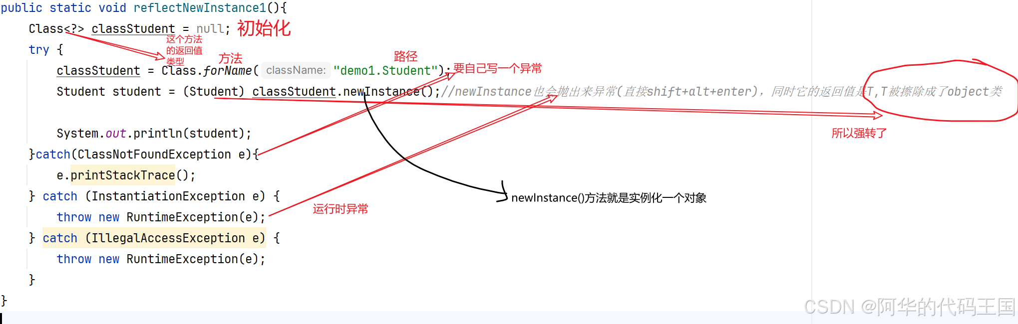 Student student = (Student) classStudent.newInstance();//newInstance也会抛出来异常(直接shift+alt+enter),同时它的返回值是T,T被擦除成了object类