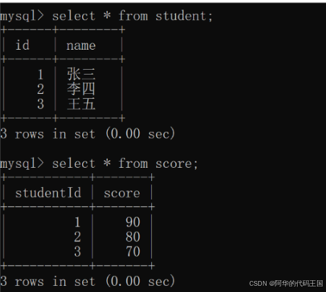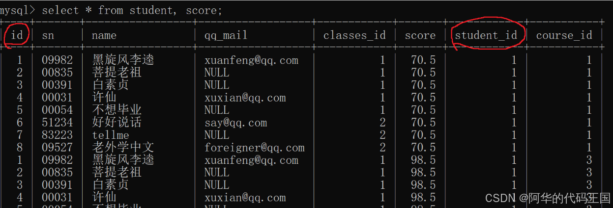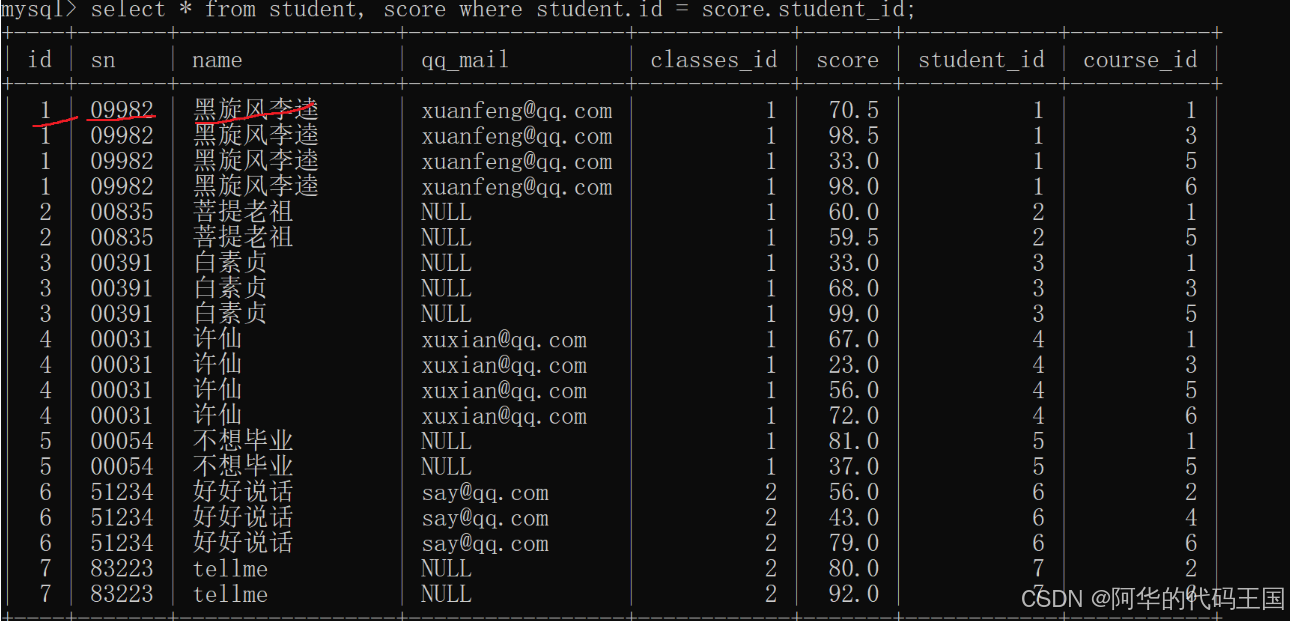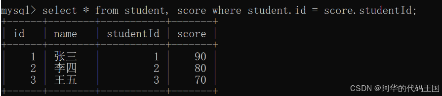 (2)指定连接条件,精简结果 : select * from student , score where student.id = score.student_id;