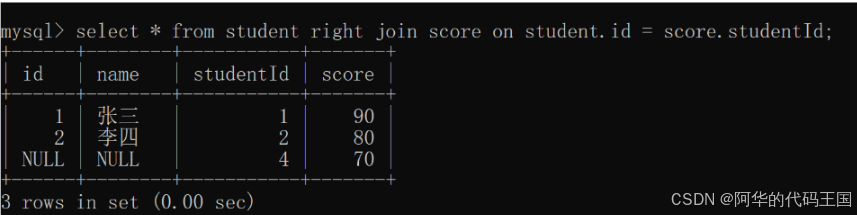 (2)右外连接: select * from studnet right join score on student.id = score.studentId; 解释:与左外连接相反