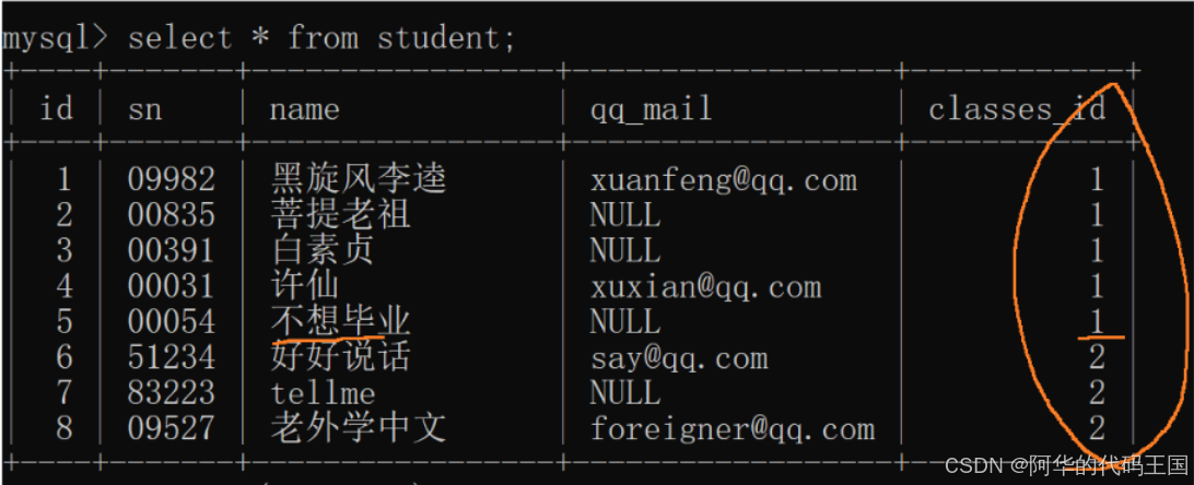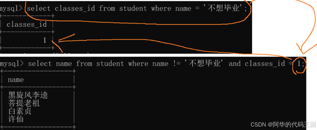 (2)先找到“不想毕业”的 班级id,再拿着这个班级id来进行查询其它同学