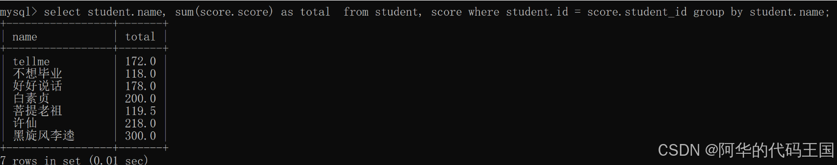 写法①:select student.name , sum(score.score) as tatal from student , score where student.id = score.student_id gruop by student.name; 写法②:select student.name ,sum(score.score) as total from student join score on student.id = score.student_id group by student.name;