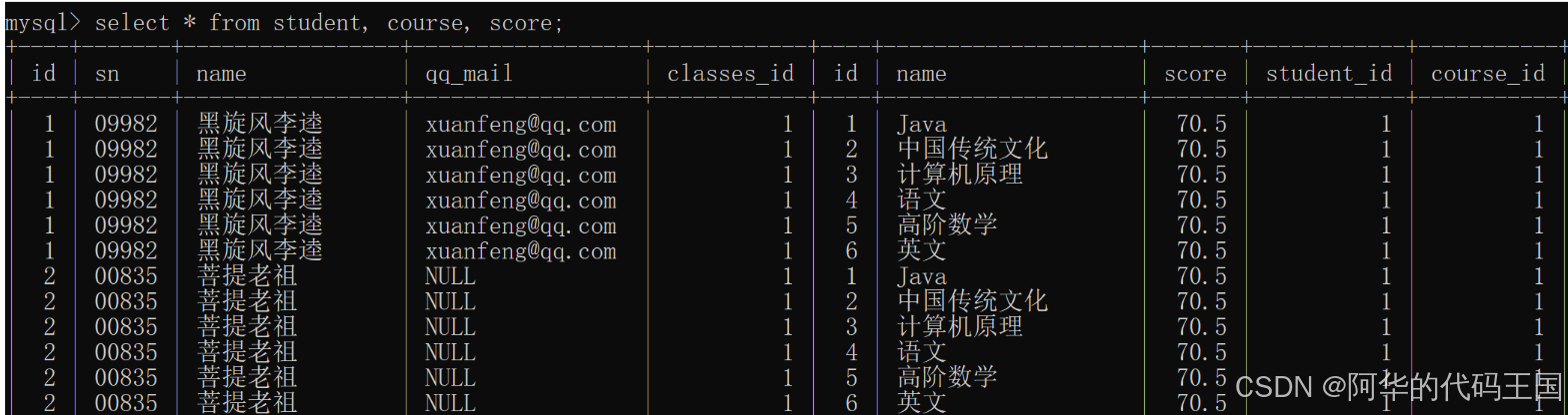 上述结果,再和course表计算笛卡尔积 连接条件 score.course_id = course.id