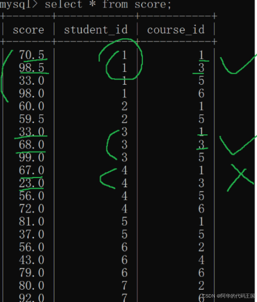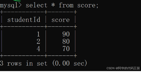 应用场景:显示 “课程3” 比 “课程1” 分数高的 同学 的 信息 (1):查表 select * from score;