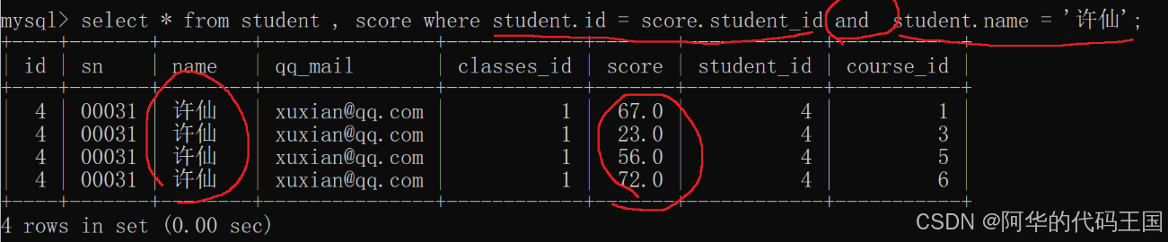 select * froms student , score where student.id = score.student_id and student.name = ‘许仙’;