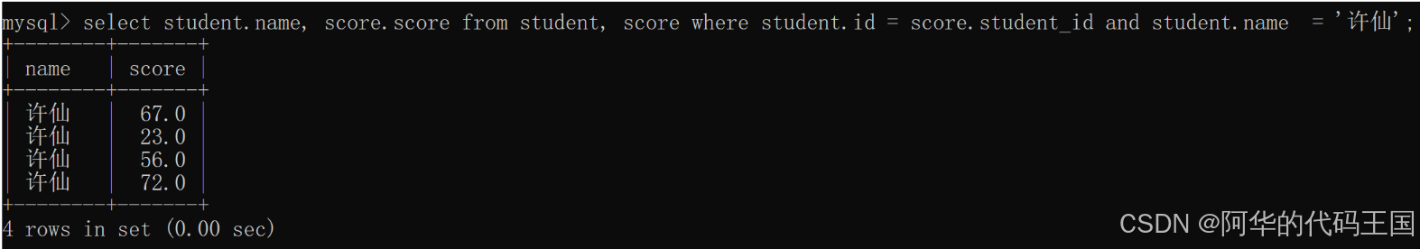 select student.name , score.name from student , score where student.id = score.student_id and student.name = ‘许仙’;