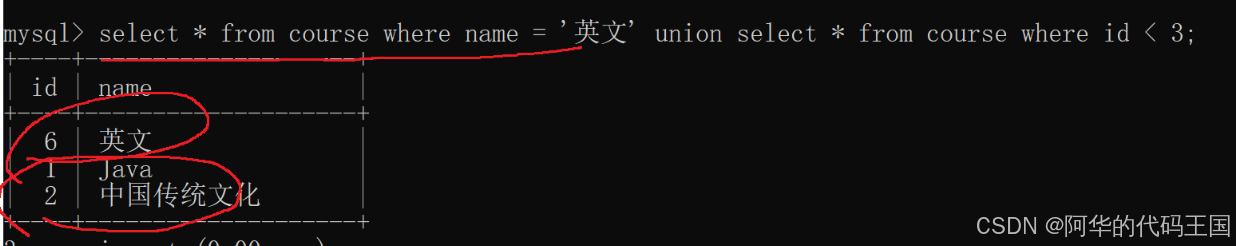 ①:在这个场景中,我们可以发现用关键字or也可以解决,但是如果所查询的是两个不同的表就必须要用union这个关键字了