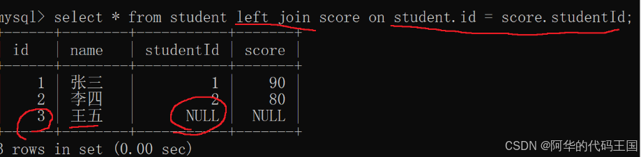 (1)左外连接 select * from student left join score on student.id = score.studentId; 解释:左外连接就是以左表为主,保证左侧的表的每一个记录都显示在最终的结果中,如果这个记录在右表中没有匹配,那就把对应的列填充成NULL;