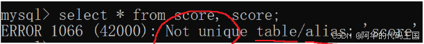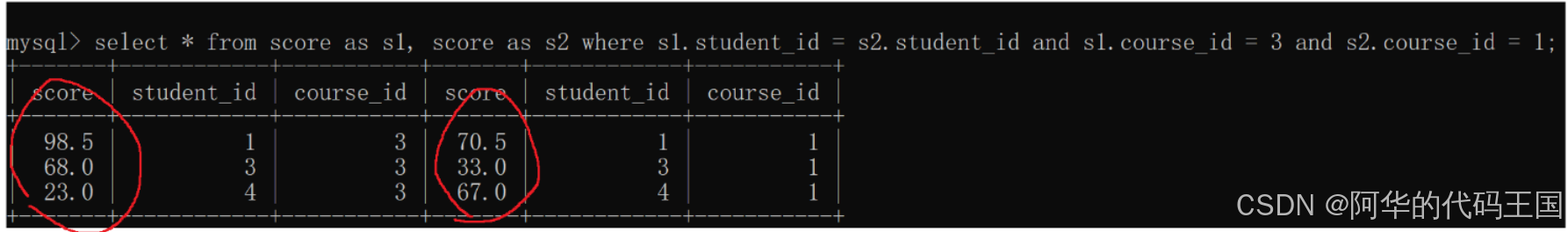 查询的表名相同,我们要给这个表起不同的别名可以 (3):select * from score as s1 ,score as s2 where s1.student_id = s2.student_id ;